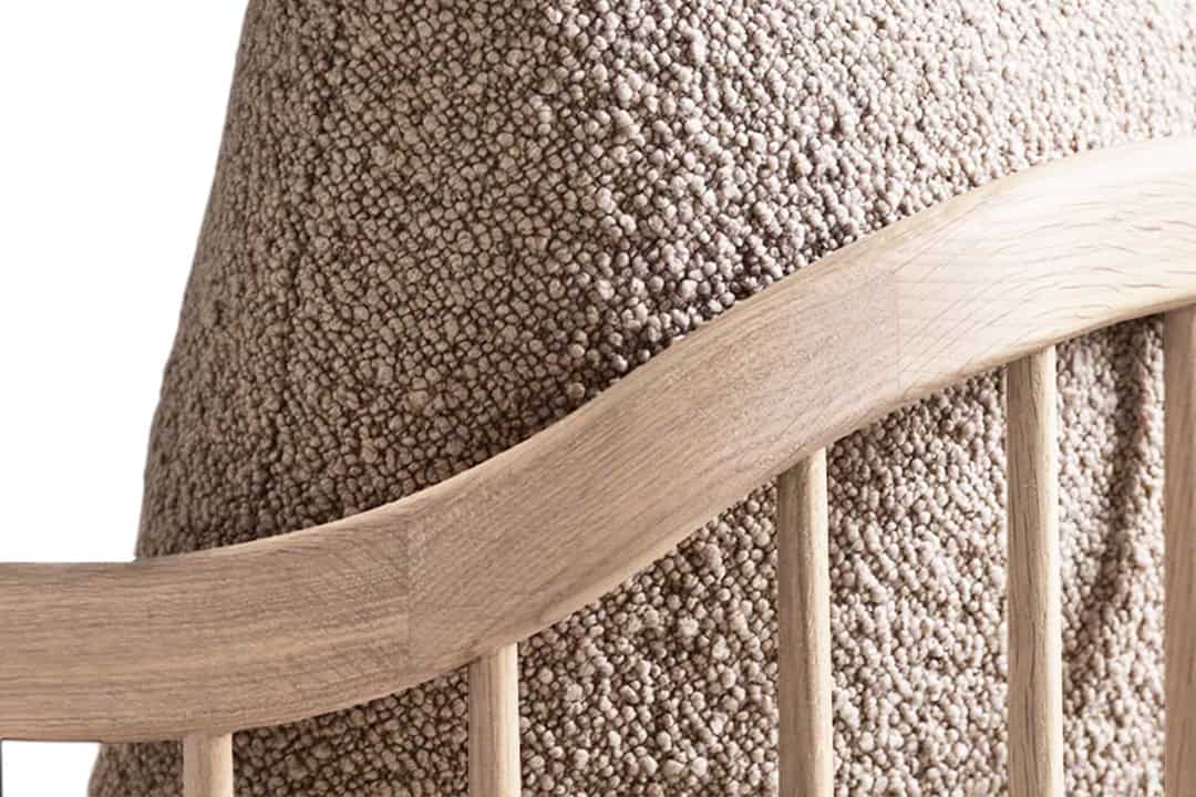 The gently curved top rail is expertly crafted from solid oiled oak, showing natural grain and precise joinery. This detail brings lasting stability, organic warmth, and elegant flow to the chair’s silhouette.