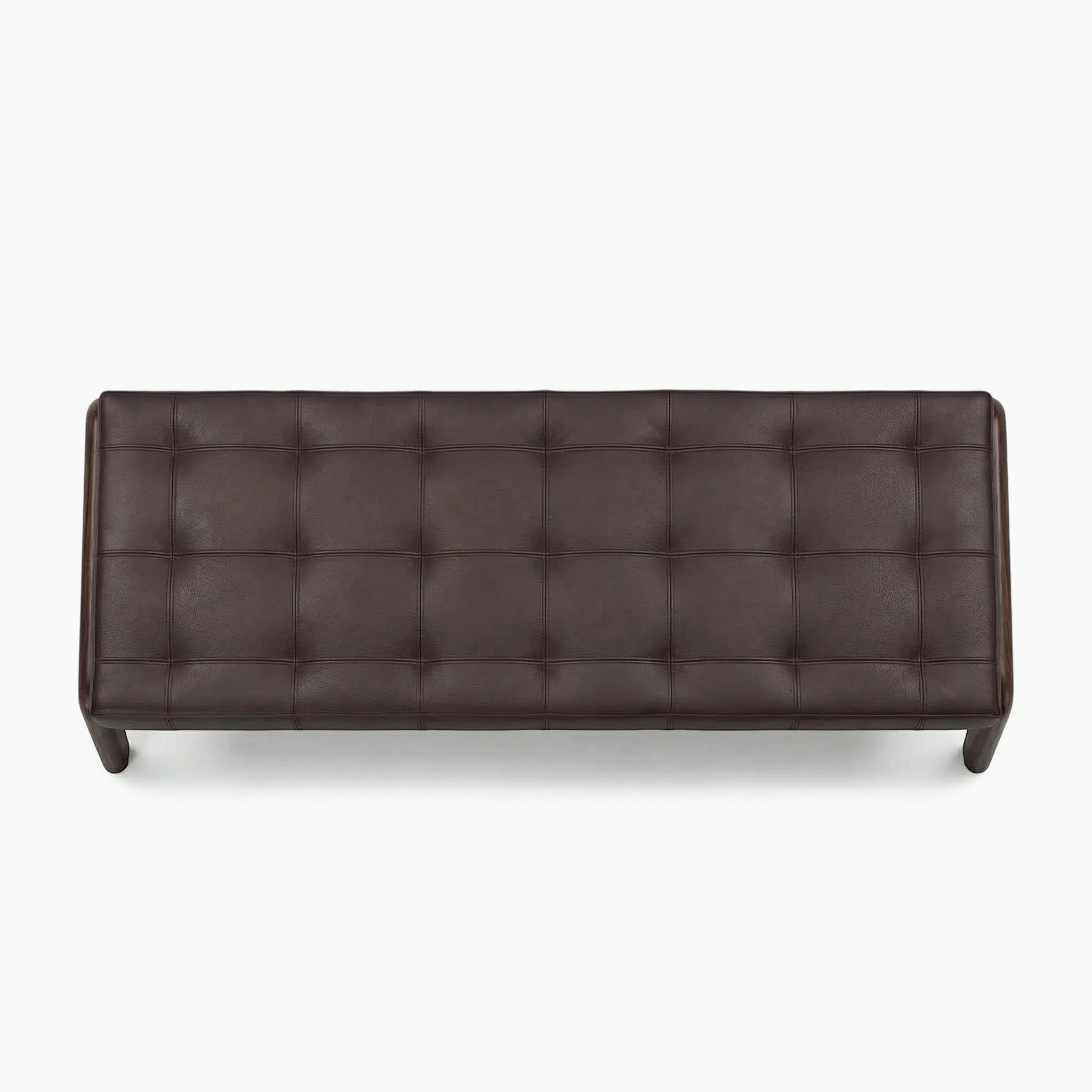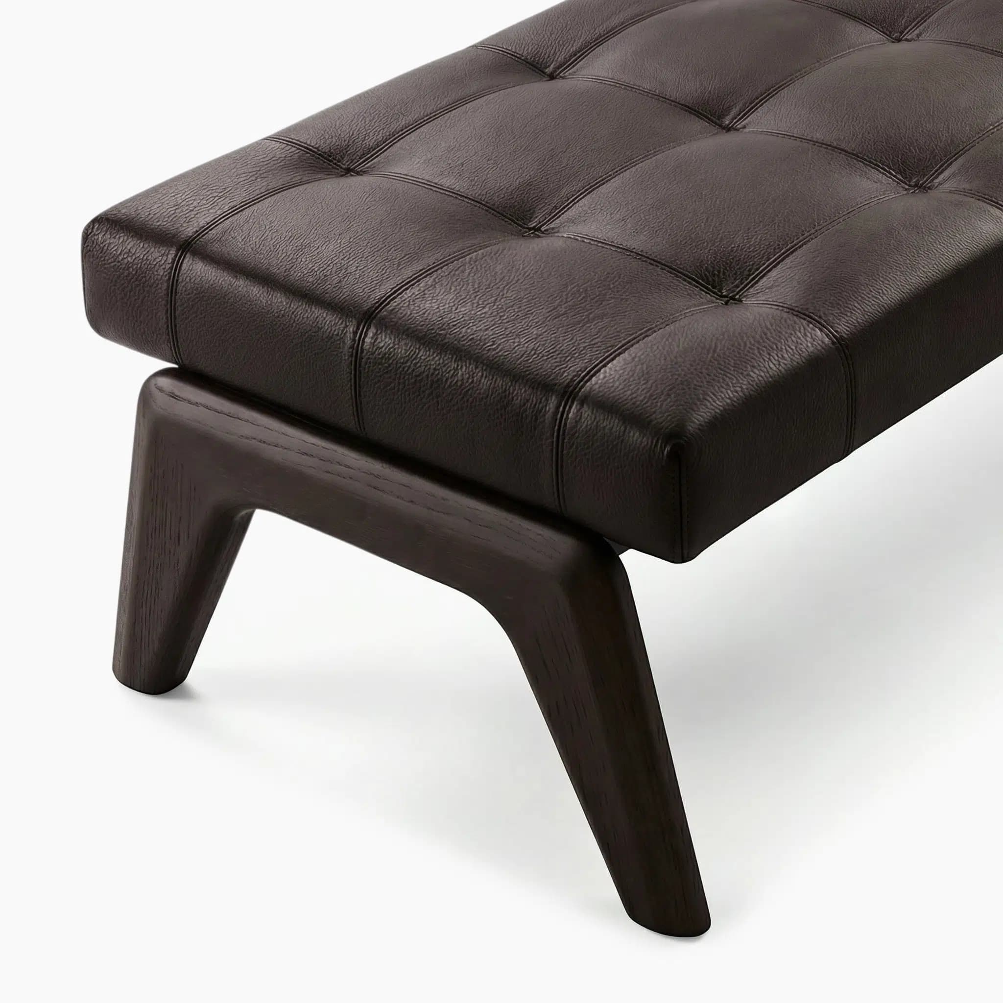 The Kirk Bench features meticulous topstitching that forms a distinctive geometric square pattern in leather and velvet versions, while the fabric option offers a refined quilted texture.