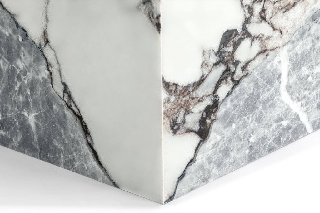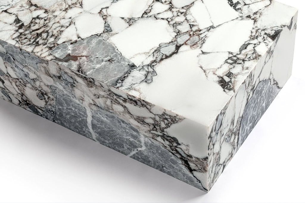 Crafted from lightweight hollow-core marble in five stone varieties: Arabescato, Calacatta Viola, Carrara, Coral Red, and Kunis Breccia. Combines a bold sculptural look with strength and easier placement.
